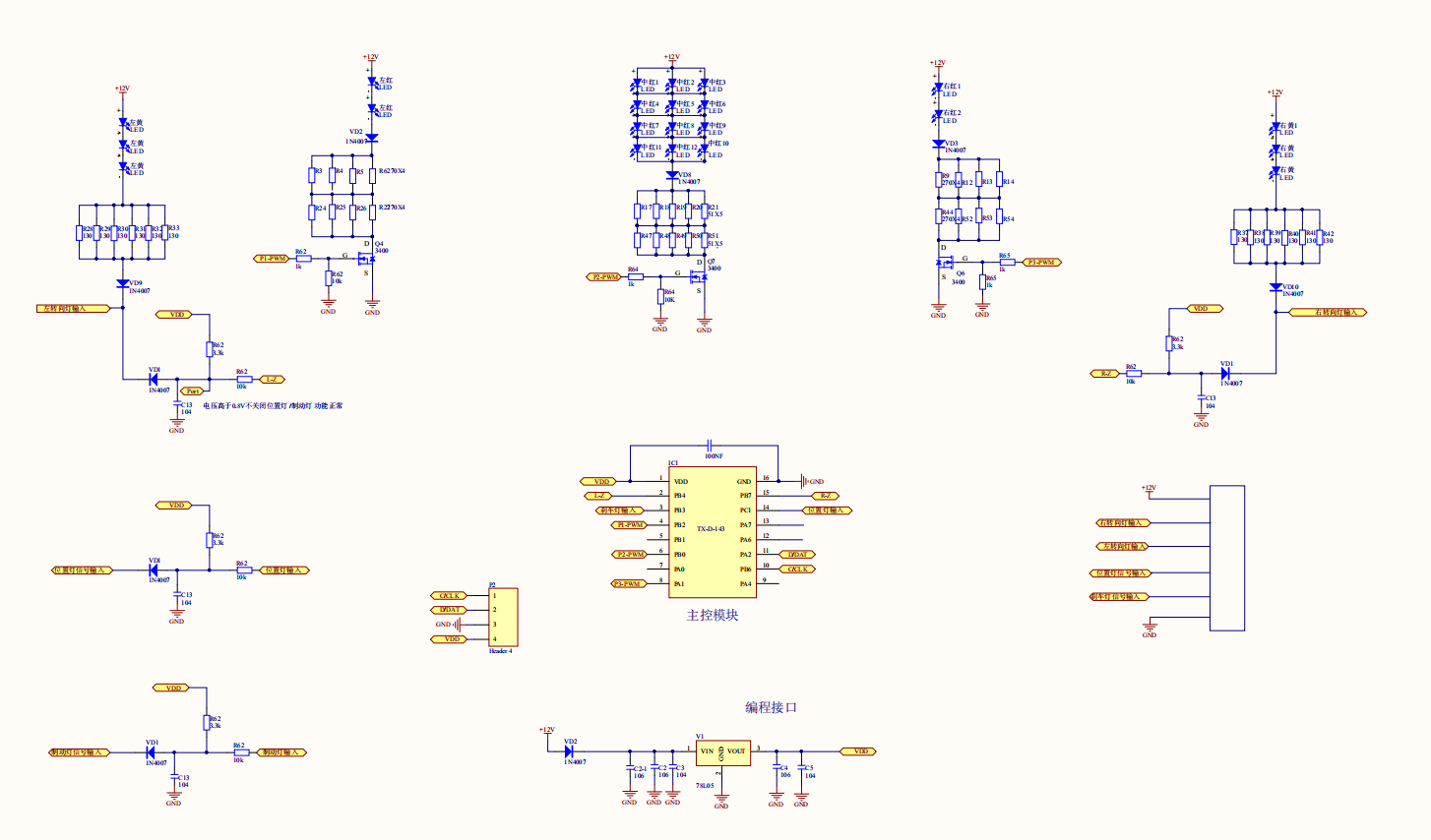 位置灯与制动灯分别分三块,左右位置灯中包含转向灯,由芯片单脚控制输出,左右位置灯、转向灯和制动灯可单独或同时点亮、熄灭。