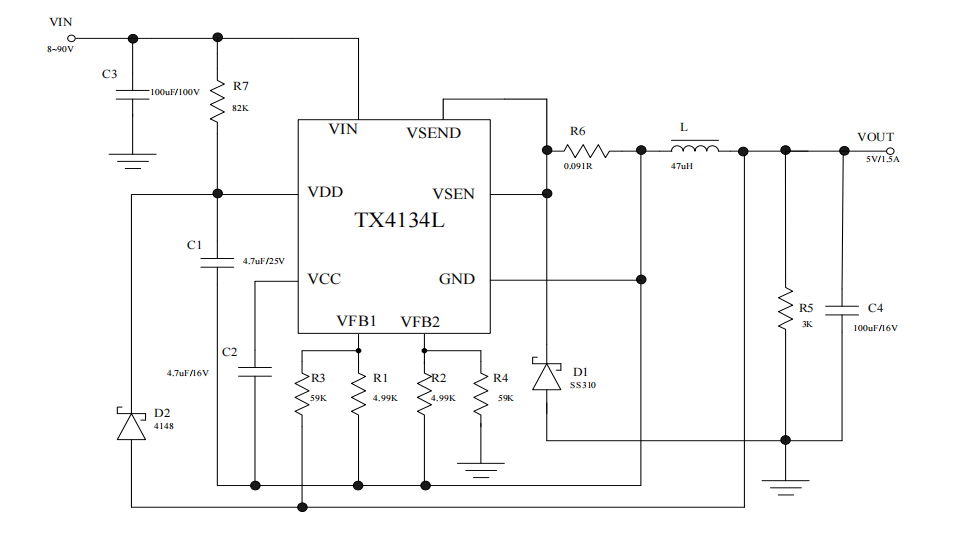TX4134L具有低待机功耗、高效率、低纹波、优异的母线电压调整率和负载调整率等特性。
