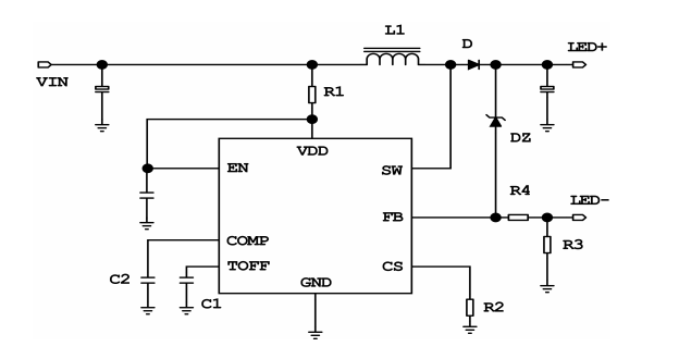 它通过调节外置的电流采样电阻,能控制高亮度LED灯的驱动电流,使LED灯亮度达到预期恒定亮度。